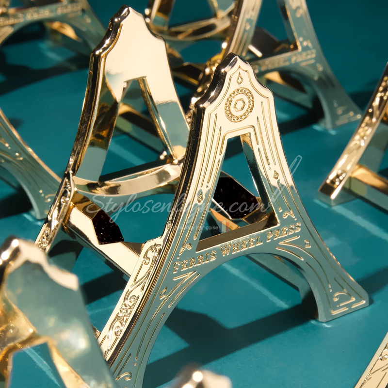 Sublimez votre bureau d’écriture avec le Ferris Wheel Press Ink Carriage – Modern Antiques™ Edition, un support luxueux conçu spécialement pour les flacons d’encre 38 ml. Inspiré des structures iconiques et des objets d’art métalliques, ce présentoir doré ajoute une touche d’élégance et de raffinement à votre espace créatif.