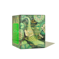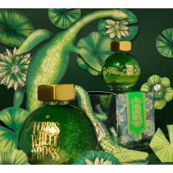 Le flacon iconique de Ferris Wheel Press, avec son bouchon doré unique et sa silhouette ronde, se présente dans un coffret illustré d’un univers luxuriant — nénuphars, créatures curieuses et motifs aquatiques — parfait pour les collectionneurs et les amoureux de beaux objets.
